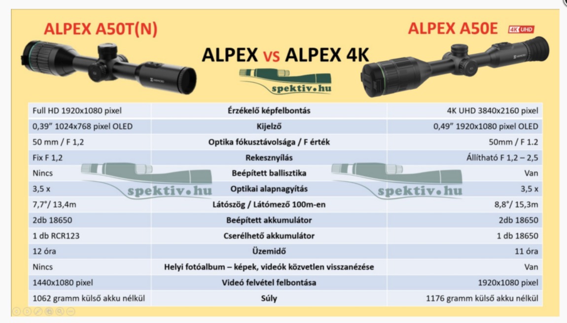 Ez az Alpex éjjellátó 4K felbontású érzékelővel szerelt változat, beépített 1000m-es lézeres távolságmérő nélkül. Fontos tudni, hogy a kamera fő elemének számító éjszakai/nappali képalkotást végző érzékelőelem technológiáját a Hikmicro anyavállalata a Hikvision amely a világ legnagyobb kameragyártója már hosszú évek óta feljeszti, biztonságtechnikai rendszerei részére. Ez a hosszú évek alatt megalapozott tudás óriási előnyt jelent az alapból „vadászati” célú versenytársaival szemben. A szenzor 4K azaz 3840×2160 pixel felbontású és rendkívül nagy érzékenységű. A kijelző a korszerű új formátumú kerekített kialakítású 0,49″-os OLED technológiára épül és 1024×768 pixellel rendelkezik. Az 50 mm-es frontlencse és az okulár 3,5x-es optikai nagyítást ad amit a digitális zoom funkcióval 7/14/28x-os értékre nagyíthatunk.
